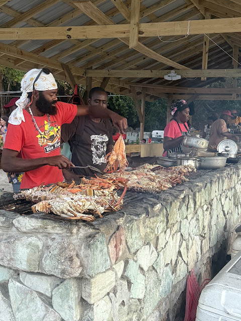 A local, Mr MandyMan, came out in his little boat to greet us as he had been in touch with African, the gentleman that had sold us on using his mooring ball back in Bequia. MandyMan wondered if we wanted to go ashore for a beach BBQ. While lobster is popular, we put an order in for ribs and headed over to the 'dining area' just before sunset. The hurricane also went through the Tobago Cays, so there were downed trees and the BBQ area, had only just been rebuilt. Between the heat of the Caribbean evening and the heat of the BBQs coals, the local chefs were truly earning their Eastern Caribbean dollars (EC's). Even with the setback from Beryl, there were lots of guests arriving for the BBQ that evening and despite the at capacity dining, we scored a prize table right on the beach.